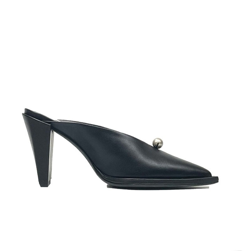 Sculptural silhouette and elegant detail – CLORINDA BLACK NAPPA is a high-heeled sabot in ultra-soft black lambskin, featuring a luminous pearl accent for a refined yet artistic finish.