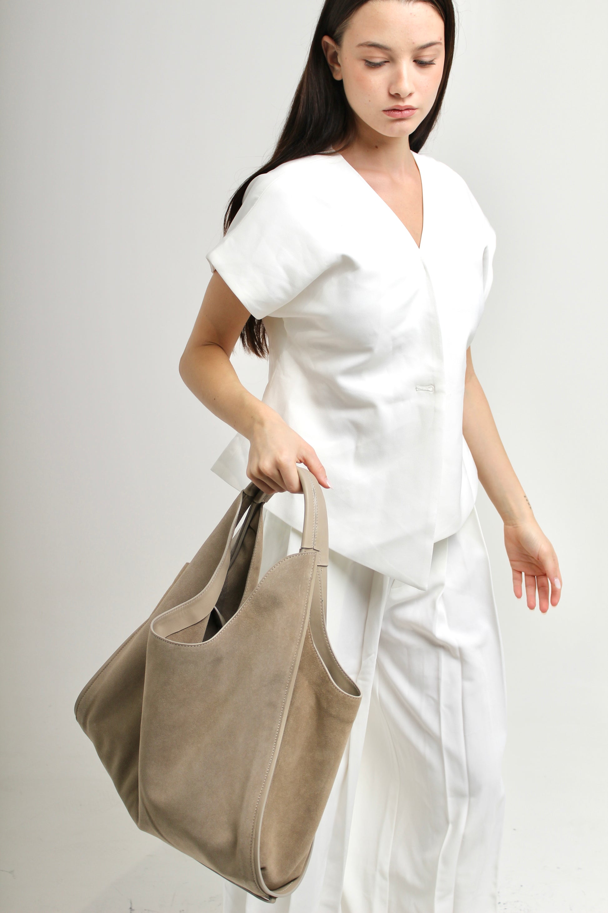 Minimalist elegance in a practical format – the EDVIGE SUEDE SAND is a large, unlined suede bag designed for refined simplicity and daily use.