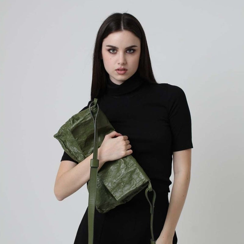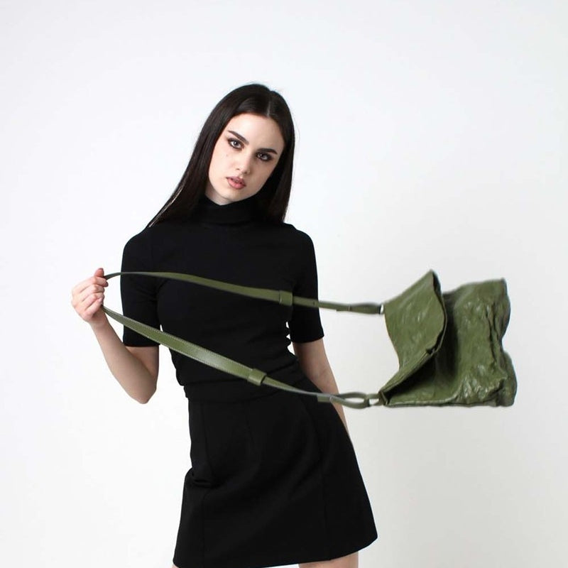 Contemporary design meets traditional craftsmanship – GALATEA OLIVE ALUMINIUM is an oversized clutch handmade in Italy, featuring luxurious olive green nappa leather with a crumpled aluminium finish.